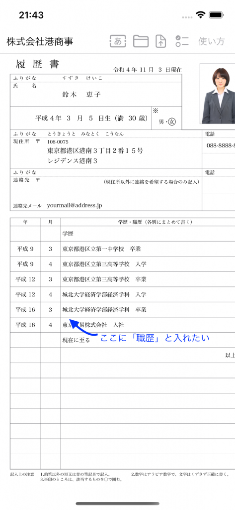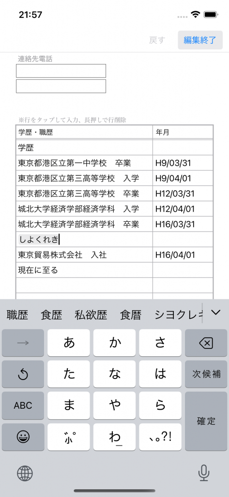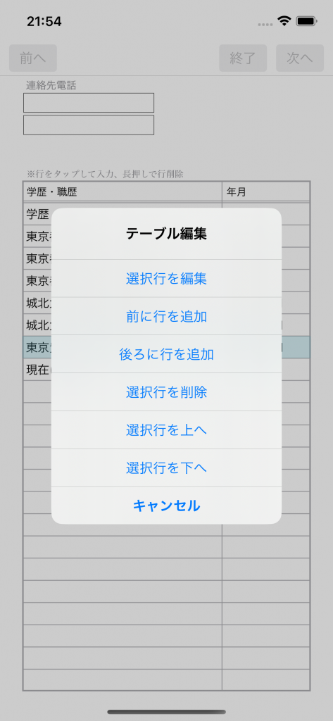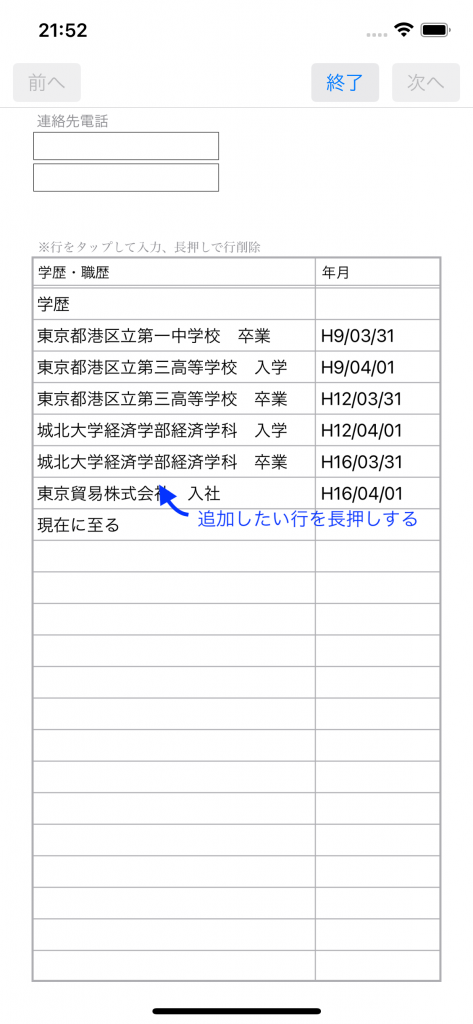 履歴書の「学歴・職歴」や「免許・資格」などの一覧表示に行を追加したい場合があると思いますが、その場合は入力フォームに切り替えて追加したい行を長押ししてください。