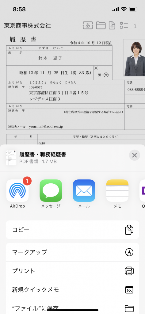 「メール」を選んだ場合は、PDFが添付されたメールを表示します。ここで定型文を修正後、送付先メールアドレスを入力して送信します。